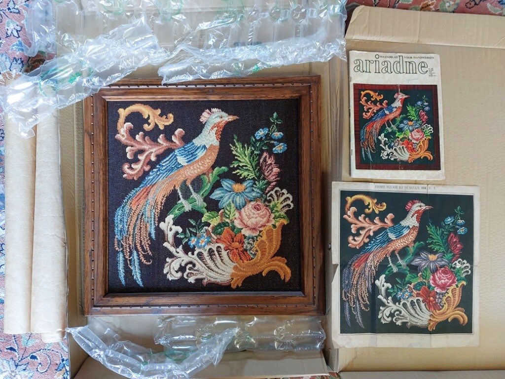 Het geborduurde schilderij werd een paar dagen geleden besteld en uiteraard bood ik ook het patroon aan, maar daar had de besteller geen belangstelling voor. Dus plaats ik het nu in m’n shop, die weliswaar dicht is, maar dan is er nog weer wat nieuws om tegenaan te kijken op de voorste pagina. Ook wij vinden het na twee eeuwen nog wel een mooi plaatje, van die kleurige vogel met de prachtige veren. Maar we zijn als mensheid gelukkig wel een beetje opgeschoven in het weten dat we niet zomaar dieren kunnen doodmaken omdat we hun veren willen. (Nou ja, misschien is het in onze tijd zelfs nog wel erger dan twee eeuwen geleden…..)