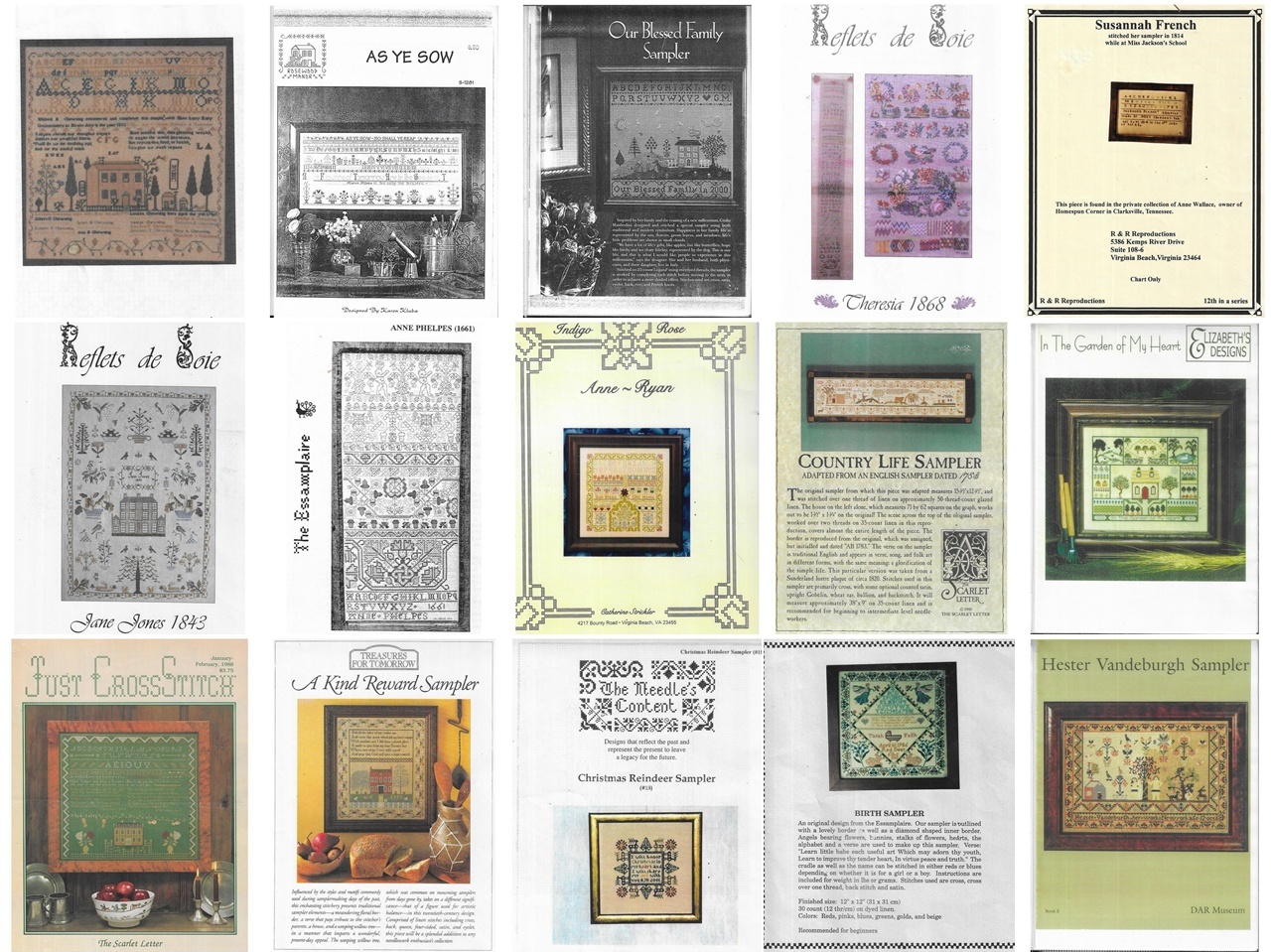 Ook van de prachtige Engelse merklappen – samplers – zijn losse patronen gemaakt zodat ze kunnen worden nagemaakt.