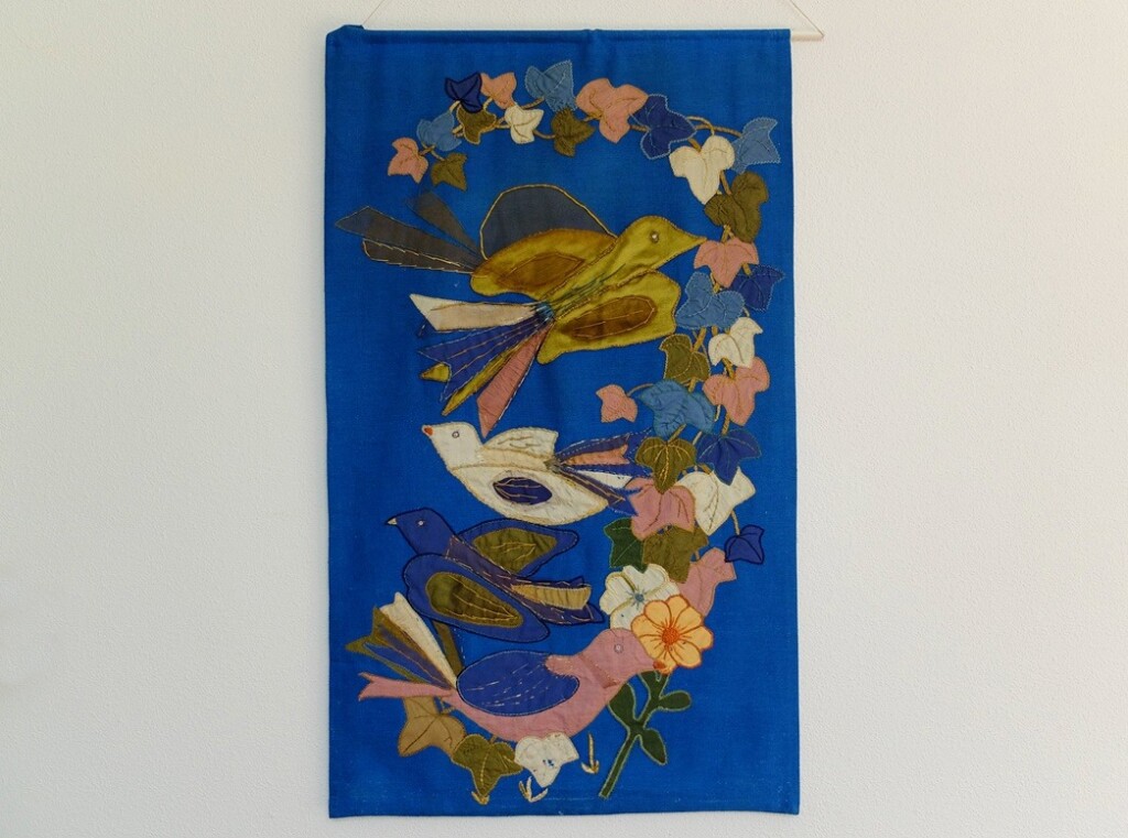 Voor deze mooie pinksterdag bewaarde ik een fraai blauw wandkleed met geappliceerde vogels. Het heeft een bijzondere herkomst (maar dat hebben eigenlijk alle handwerken, alleen die weet ik niet allemaal). Een prachtig symbolisch wandkleed voor Pinksteren (en daarna is het ook nog mooi!).