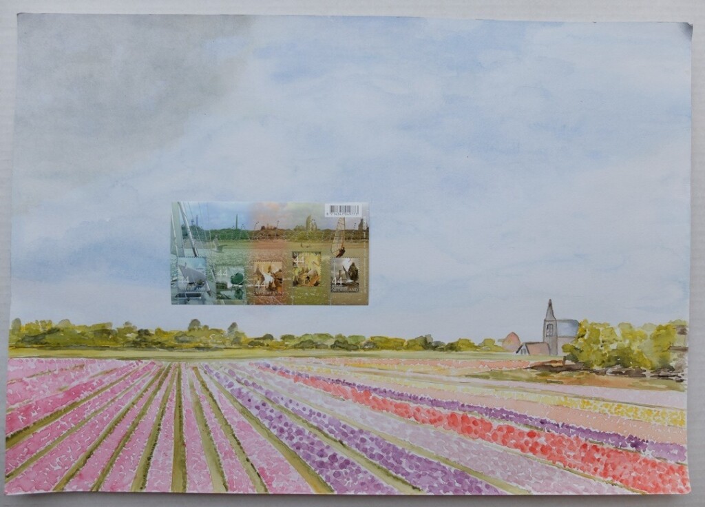 De aquarel waarop ik één velletje postzegels legde is door mijn moeder gemaakt. Zij hield ook van Mooi Nederland.