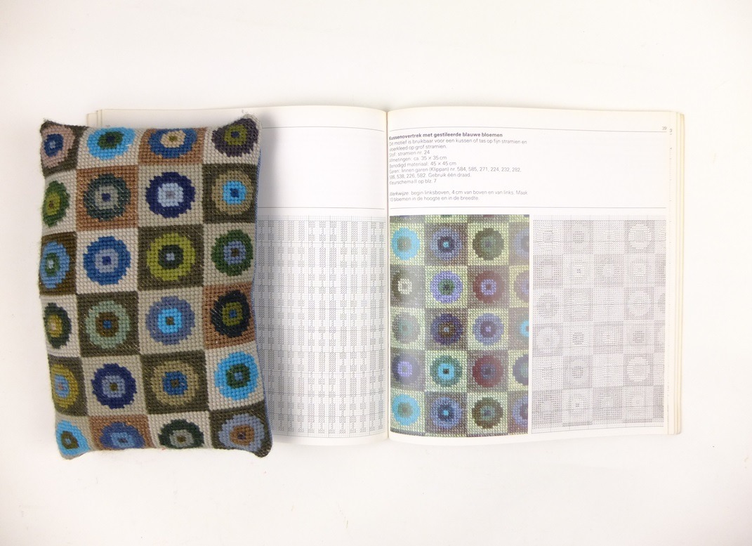 En hier en hier is een borduurwerk met bruine motieven (naar voorbeeld uit dit boek) nog een keer te zien.