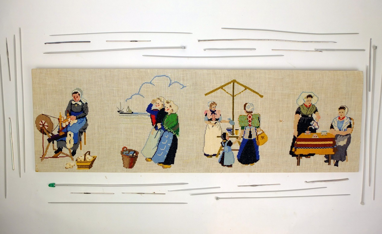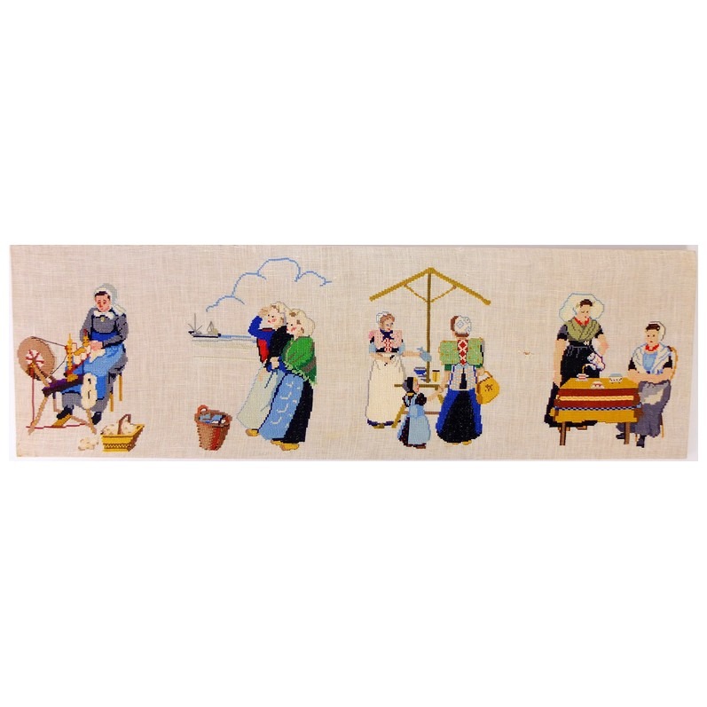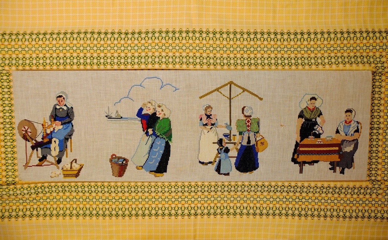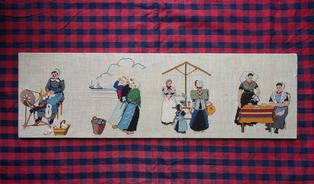 Vier geborduurde oudhollandse taferelen in klederdracht. Dit past in de herleving van de aandacht voor nostalgie en ook voor ons Nederlandse erfgoed. Het borduurwerk is gespannen op een houten paneel waardoor het makkelijk neer te zetten is. Achterop twee haken met een stevige ophangdraad. Dit is niet professioneel afgewerkt.