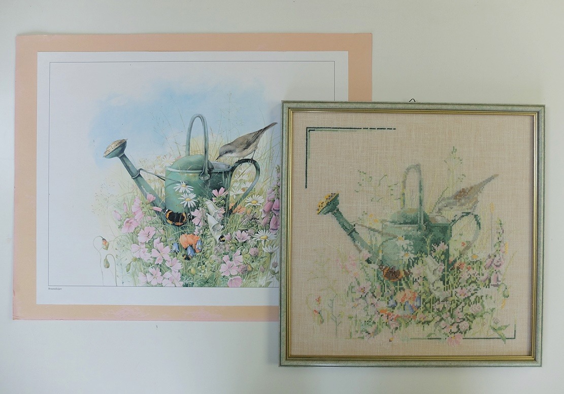 Ingelijst borduurwerk van braamsluiper op gieter.