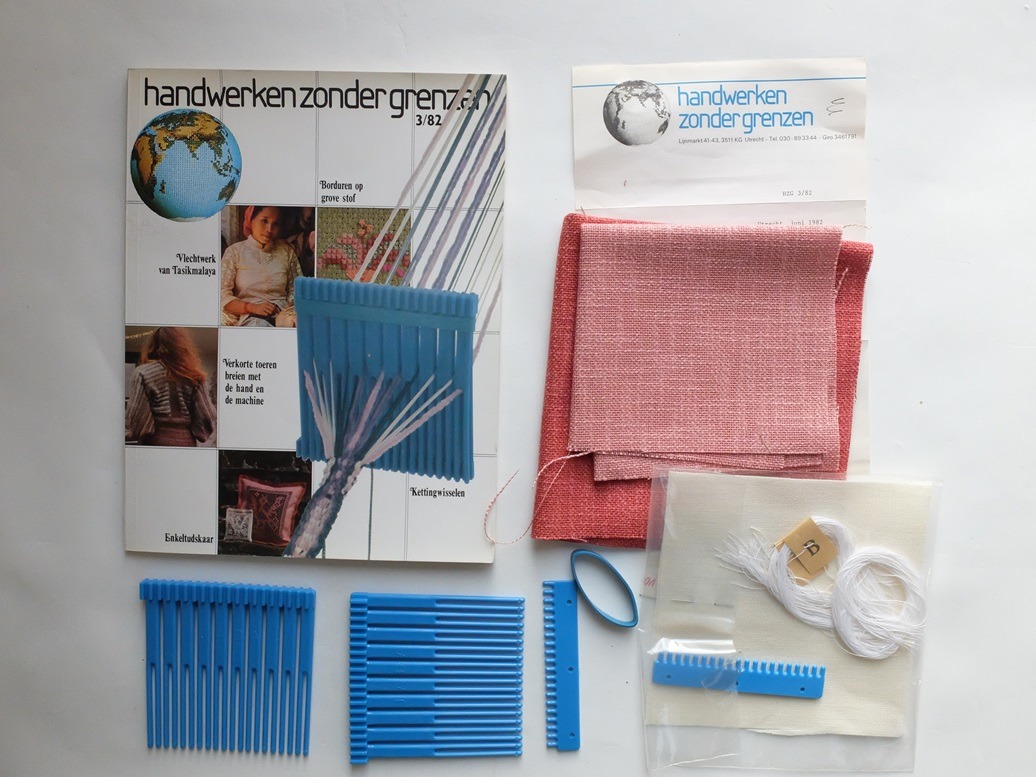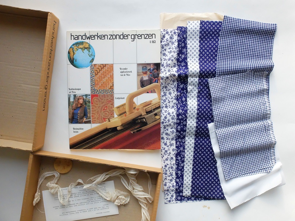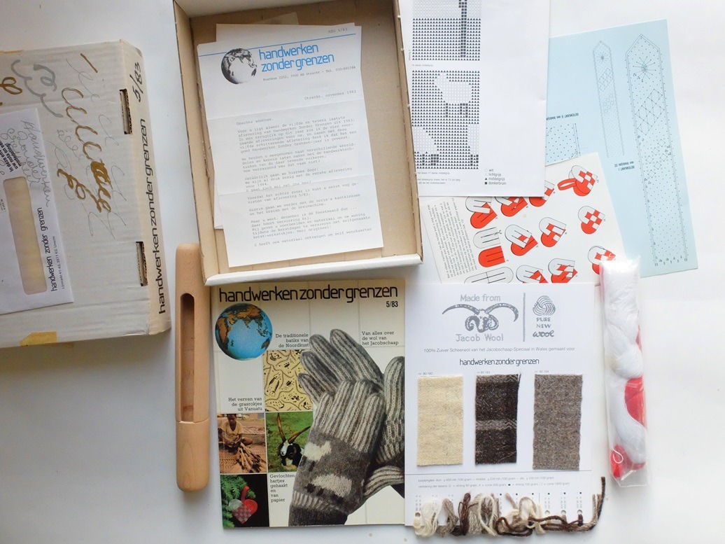 Grote bananendoos vol met handwerkpakketten, uit de begintijd van het tijdschrift Handwerken zonder Grenzen.