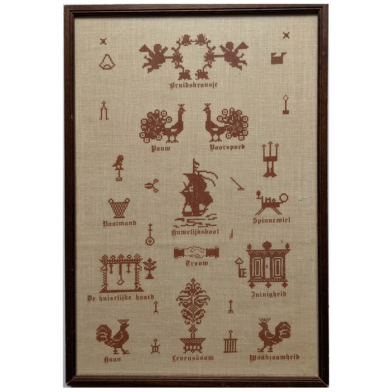 Achterop dit schilderijtje staat uitleg over de betekenis van de huwelijkssymbolen van oude merklappen.