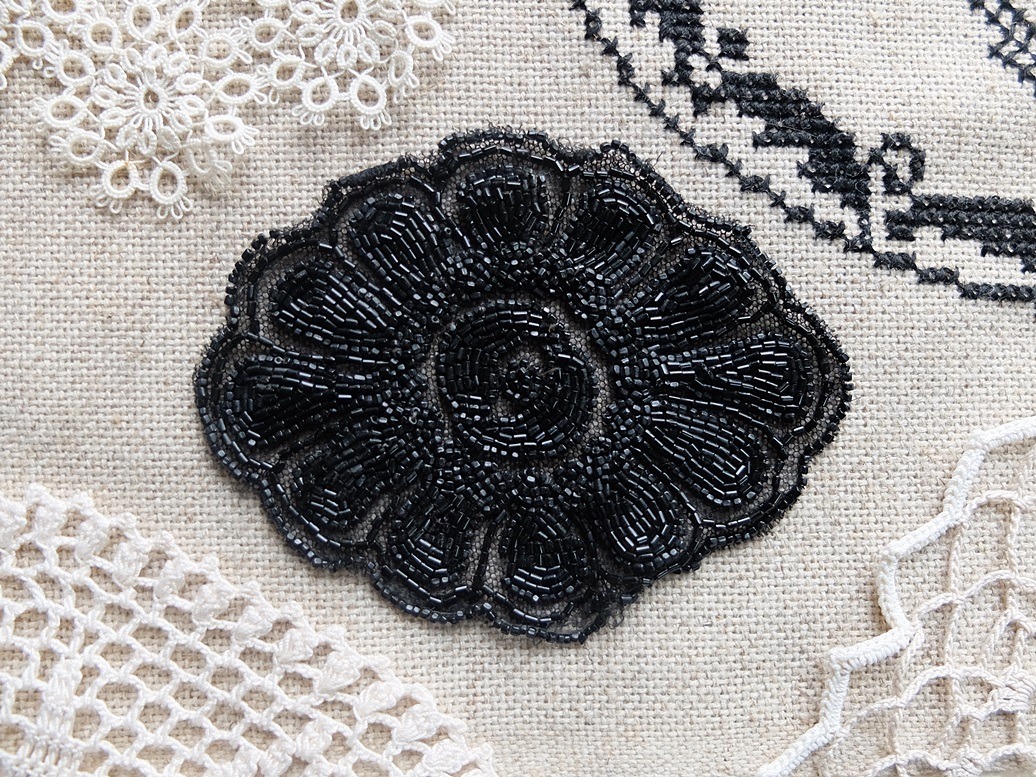 Gitzwarte kraaltjes zijn stevig vastgezet op een ondergrond van tule (honingraat)