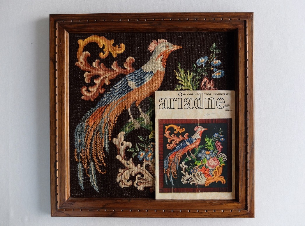 Het borduurpatroon van de vogel op de voorkant is helaas niet bijgesloten,