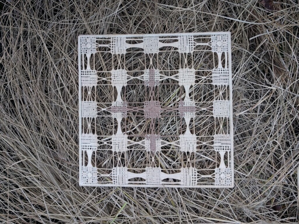 Soms komt iets ineens heel mooi uit op een bepaalde ondergrond. Dit werkje van pulled thread work / open naaiwerk staat in m’n kamer en bezorgt me al een hele winter kijkplezier. En nu lag het even op het dorre en afgesneden gras.
