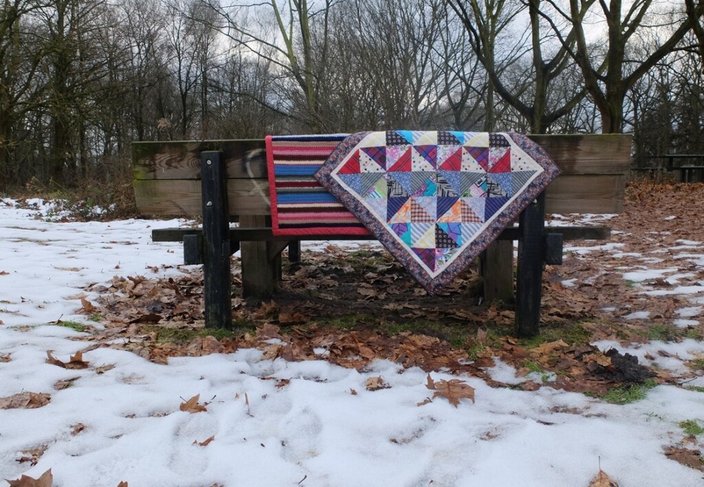 Zelf heb ik ook wel eens zoiets gemaakt (maar dan veel kleiner): met oude lapjes van m’n schoonmoeder, restanten van waar zij ooit kleding van had gemaakt. Dit dekentje lag gister nog in m’n auto toen ik wat aan het fotograferen was. Het is gewoon een makkelijk en succes-verzekerd patroon met die driehoekjes in zandlopermotief. De deskundige zegt hierover op haar blog: “Ik probeer altijd duidelijk te maken dat wij ook zo onze eigen regels hadden: het gebruik van de driehoek, de blinde zomen, de grote ster in het midden en een grote variatie aan het gebruik van diverse stoffen.”
