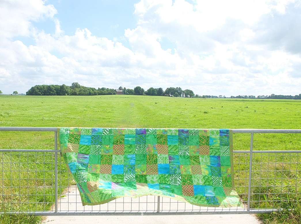 In alle opengestelde kerkjes, molens en dorpshuizen kon je met een passepartout vrij binnenlopen en na bezichtiging kon je met de plattegrond de route verder vervolgen naar het volgende dorpje. Die ‘dorpentocht’ in het Groningerland was op zichzelf ook al een belevenis! De uitgestrektheid en weidsheid van het open landschap is prachtig! Mensen (zoals wij) die het noorden van ons land niet goed kennen wanen zich met vakantie. Op dit plekje pauzeerden we even om wat te eten. Na zoveel quilts van anderen te hebben gezien wilde ik ook wel even zelf op een eigen picknickkleed zitten. Maar daar gunden we ons toch ook weer geen tijd voor: we wilden eigenlijk weer verder rijden want er was nog zoveel meer moois te zien. Dus hing ik m’n quilt over een hek. Wel nam ik uitgebreid tijd om net zo lang te wachten tot dat kleed eindelijk tussen alle windvlagen door een paar seconden recht naar beneden hing. Toch gebruik ik die foto (waar ik die moeite voor deed) nu juist nìet! Dit is leuker: hier zit beweging in! De beweging van: we willen weer dóór! Achter de bomen ligt het plaatsje Rottem waar ook weer een prachtige kerk was opengesteld.