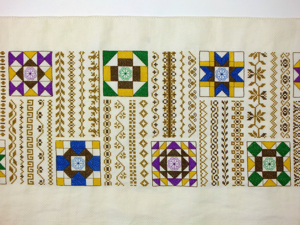 Mijn handwerkvriendin en ik houden allebei van quilten en borduren en vandaag hadden we weer eens gelegenheid om daarover bij te praten. Als ze komt heeft ze al een lange reis achter de rug dus eerst koffie-en-bijpraten. Maar daarna gaan de manden en tassen open en laat ze me zien waar zij mee bezig is. Daar geniet ik altijd zo van. Vandaag had ze haar randje-per-week meegenomen en kon ik zien dat die inmiddels een aanzienlijke lengte heeft. Moet ik aan enkele mensen nog uitleggen wat een randje-per-week is? Vast niet. Zelfs het tijdschrift over Merklappen heeft er nu aandacht aan besteed. Ja toch, er waren een paar mensen die het nog niet kenden, maar gelukkig dank zij mijn blog op de hoogte waren. Zoals mijn zus. Zij is ook borduurliefhebber, maar toch was het fenomeen nog langs haar heen gegaan. Ze borduurt werkelijk prachtige (andere) dingen en was daar Randje per week met quiltblokjelaatst in de trein ook mee bezig. De conducteur kwam langs en bewonderde haar werk. Daarna liep hij door, maar kwam toch nog weer even terug. Speciaal om te vertellen dat zijn vrouw ook zo van borduren houdt, en helemaal verslaafd is aan het randje-per-week. Gelukkig wist m’n zus dankzij mijn blog wat dat was…. Terug naar m’n vriendin. En naar zoveel anderen die eigen invullingen geven aan de patronen die gegeven worden in rood en blauw. Er worden zòveel variaties verzonnen! Gewoon indrukwekkend. Zoals deze in bruintinten en met patchwork-blokken. Af en toe laat ze een randje weg of voegt ze een ander randje toe, en dat kan allemaal met dit leuke initiatief uit Vaassen!