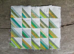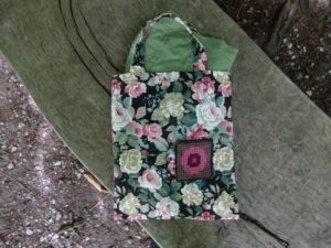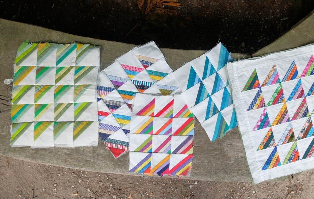 In het tasje had ik wat onafgemaakte patchworkjes meegenomen en de grote houten bank op de parkeerplaats was een mooi plekje om die even op neer te leggen. Allemaal handwerkjes met Roman Stripes motief, die ik een jaar of tien geleden maakte. Nu heb ik ze tevoorschijn gehaald en ben aan het bedenken wat ik er eens mee zal doen. Vind ik ze nog wel leuk?