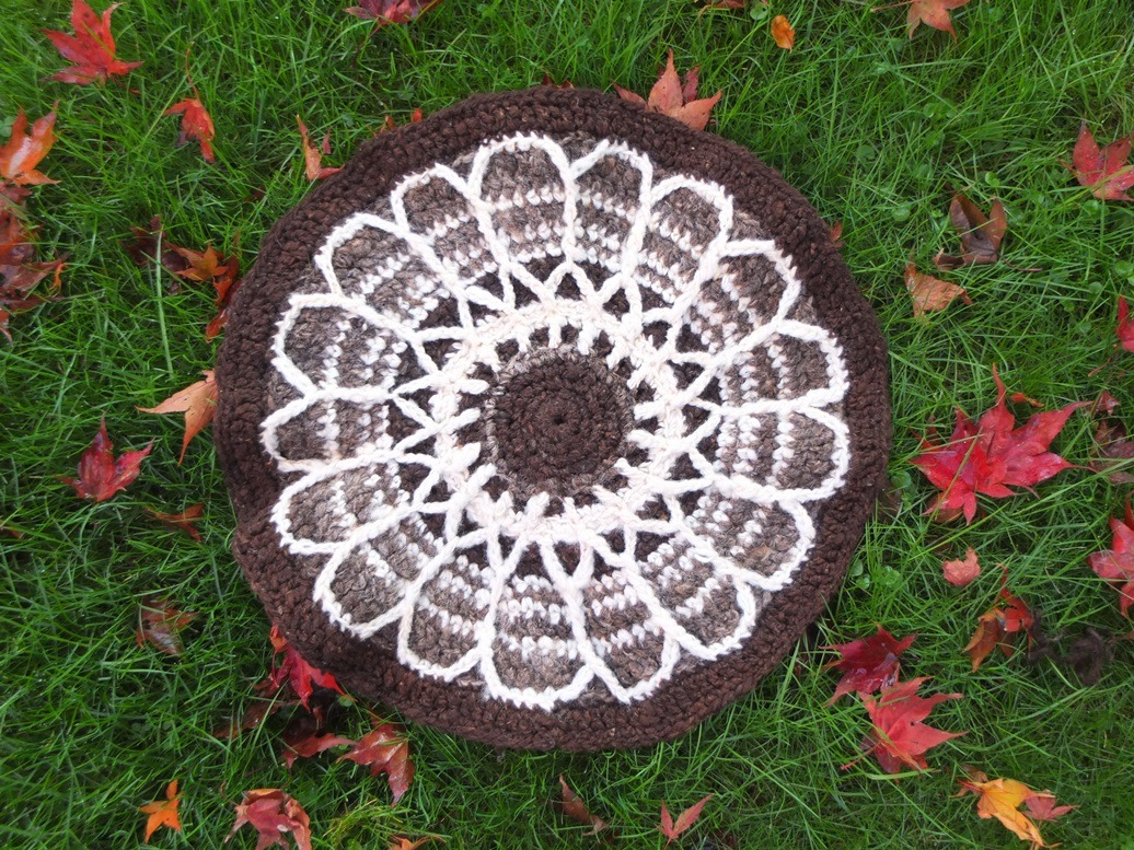 Prachtige effecten kunnen worden verkregen met haken als je dun garen gebruikt. Maar het tegenovergestelde kan ook: juist heel dik garen gebruiken! Dit kleedje is rond gehaakt met schapewol en het is één van mijn favoriete kleedjes. Ik haakte het niet zelf, maar laat het wel graag zien omdat het misschien inspirerend is. Gister was ik bij mijn schoonmoeder op bezoek en haalden we herinneringen op aan het