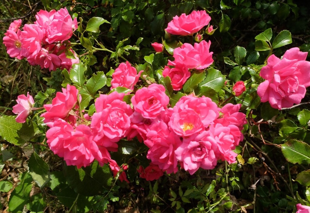 Het duurde een paar jaar, maar nu hebben de roosjes in m’n tuin de smaak te pakken! Eerst gingen er allerlei planten dood op die plek en toen fietste ik een keer in de buurt en zag bij een kantorencomplex deze zelfde roosjes in overvloedige mate bloeien. Toen ging ik op zoek naar een zelfde soort struik-roosjes vanuit de gedachte dat de grond hier in de buurt waarschijnlijk wel hetzelfde is dus wat dáár bloeit kan dan bij mij ook wel bloeien. En dat bleek goed gedacht. Nu dus een roze vracht roosjes in de voortuin.