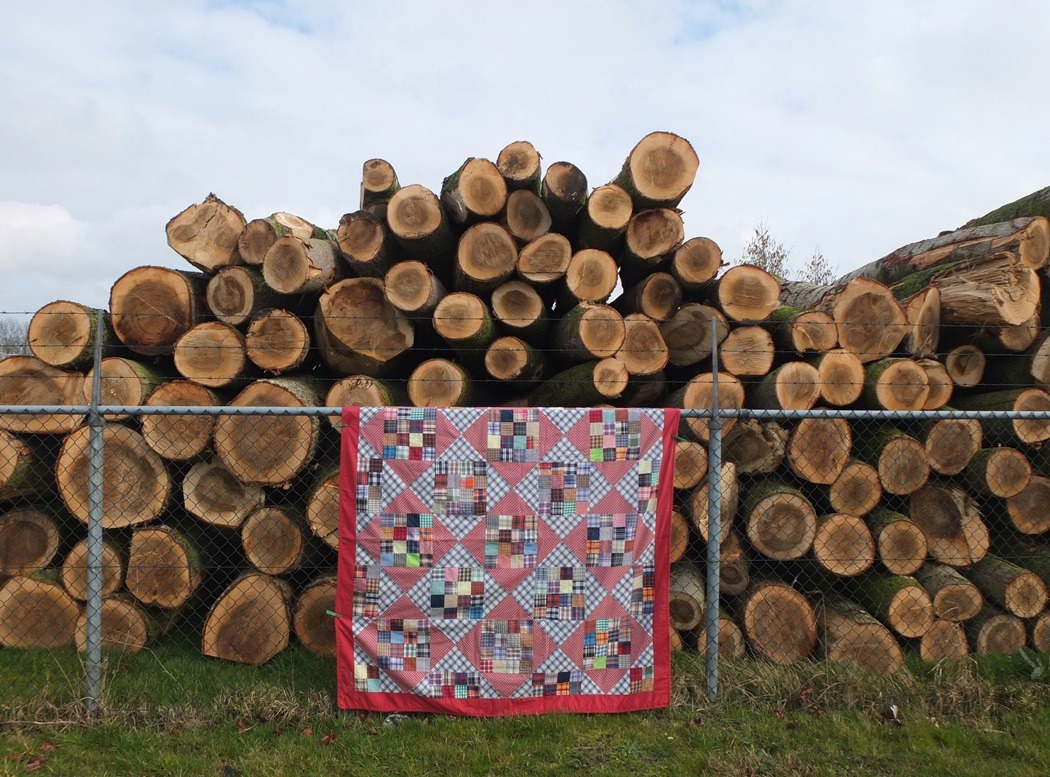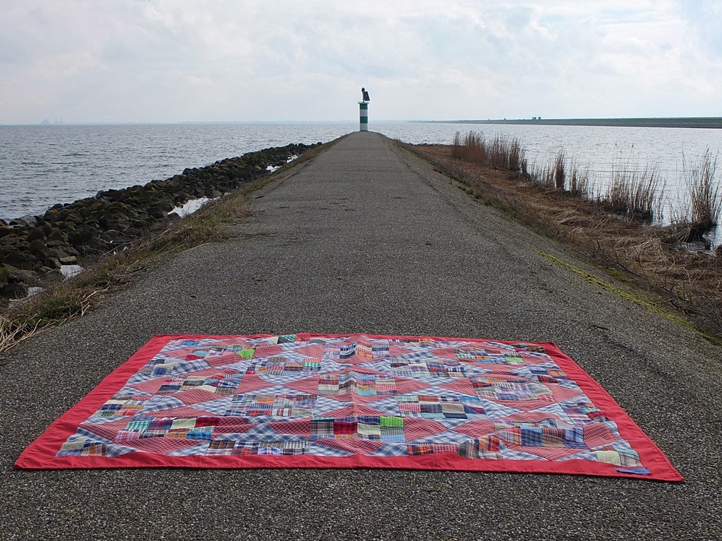 Een paar weken geleden legde ik een quilt op het midden van een zij-dijkje van een 30 kilometer lange dijk. Het was pas februari en ik was blij dat we zomaar een dag hadden waarop het niet waaide en ik die quilt daar neer kon leggen. Die dag maakte ik ook nog wat andere foto’s van deze quilt. Ik ben vaak op zoek naar plekjes waarop ze mooi uitkomen, en dit was