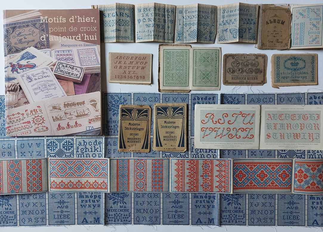Maison Sajou heeft bestaan tot 1954; het was meer dan honderd jaar in de familie gebleven maar toen stopte het. Vijftig jaar later werd het merk ‘Sajou’ nieuw leven ingeblazen door een gepassioneerde verzamelaar die visie had voor de schoonheid van de alfabet-ontwerpen en de vele andere kruissteek-patronen. Zo werden er allerlei producten uitgebracht en kon een nieuwe generatie net zo enthousiast worden over de aansprekende ontwerpen van vele alfabetten en nostalgische kruissteekpatronen. Die oude patroontjes werden een jaar of tien geleden ook op stof afgedrukt en die waren helemáál onweerstaanbaar! Op de foto’s legde ik een paar van die stukjes stof bij een paar boeken, die ik hierbij ook wil benoemen, want die boeken zijn de aanleiding voor dit blogje.