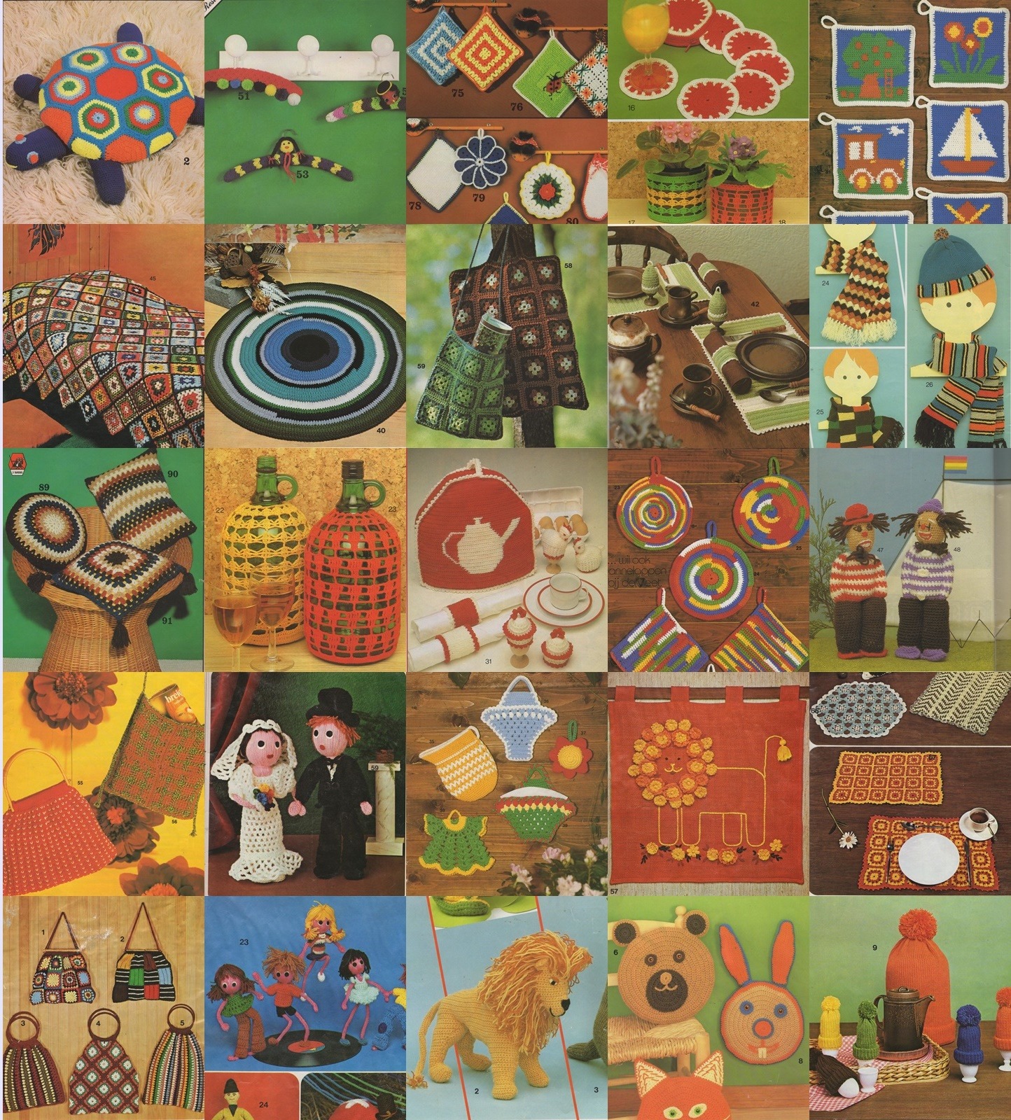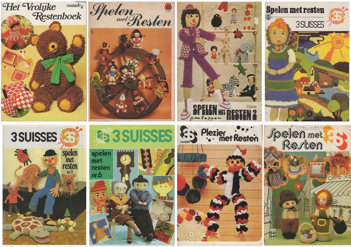 Herkenning voor wie de zeventiger jaren bewust heeft meegemaakt: haken en breien in felle kleurtjes en in die typische stijl van toen. In deze tijdschriften ‘Spelen met Resten’ staan heel veel ideetjes voor pannelappen, placemats, mutsen, onderzetters, tassen, poppetjes, kleedjes, fles-omhulsels, speelgoedbeesten en verder alles wat er toen gangbaar was. Uit deze acht tijdschriften nam ik een heel aantal foto’s over en maakte daar een collage van, om veel mensen mee te laten genieten van wat toen in de mode was. Vooral die schildpad met z’n gehaakte hexagonnen-schild is kenmerkend voor die tijd. Ergens in een zolderdoos heb ik nog zo’n bruin servies staan, en nu ik dat plaatje zie van die bijpassende groen-gestreepte placemats krijg ik zomaar zin om dat weer eens tevoorschijn te halen. Leuk, al die foto’s van dat retro-spul!
