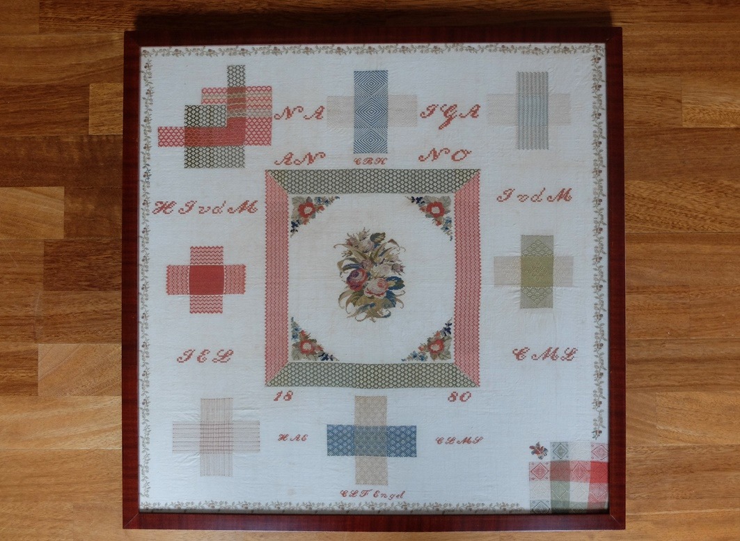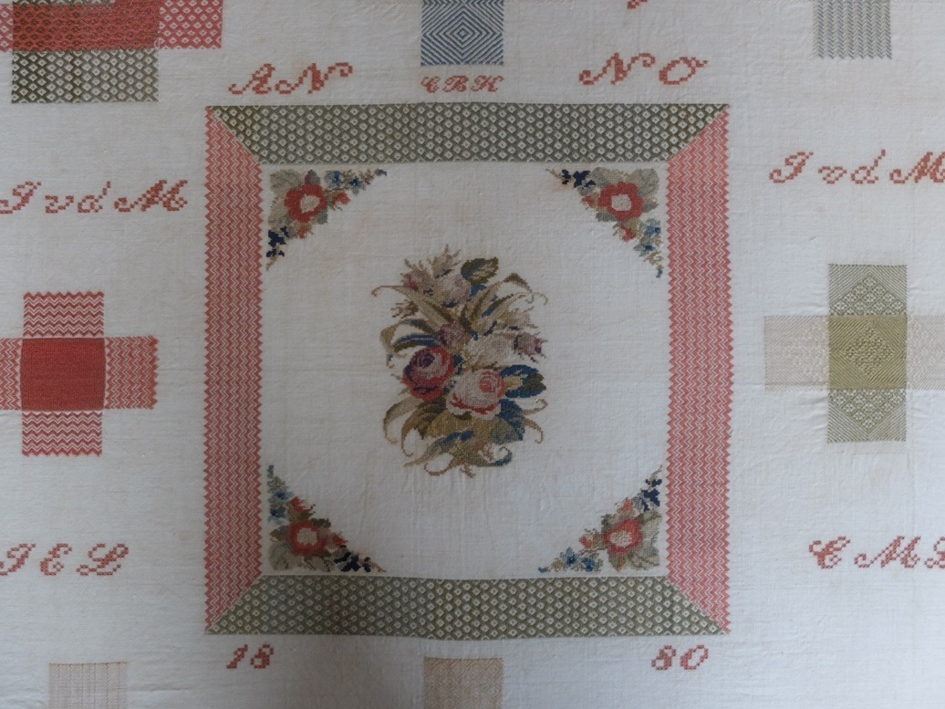 Het verhaal wat ik erbij hoorde is hetzelfde verhaal wat ik al vaker heb gehoord: jarenlang heeft die lap in een oude koffer op zolder gelegen. Niemand had er belangstelling voor. De vorige eigenaresse had zelf geen kinderen en toen zij was overleden was er gelukkig tòch iemand die bedacht dat er nog een nicht was die er misschien belang in stelde. En tòen pas werd die lap professioneel ingelijst en kon ze goed-beschermd worden opgehangen. Tegenwoordig zien we de waarde er van in, maar jarenlang lagen dit soort lappen dus gewoon in koffers op vochtige zolders. En er zijn waarschijnlijk ook veel lappen weggegooid.