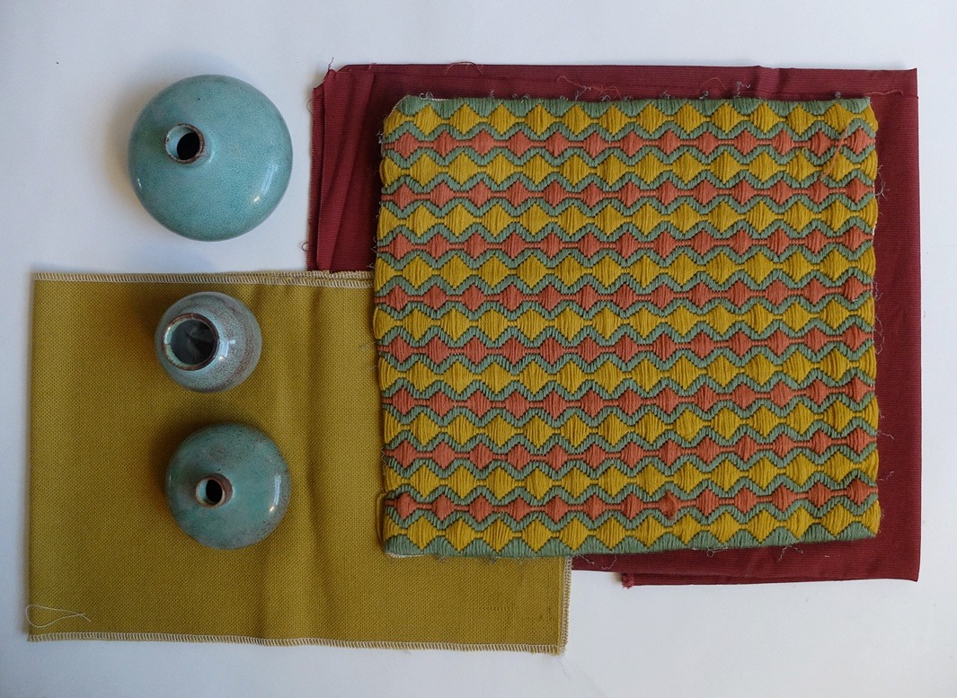 Nu ik toch al m’n stoffen tevoorschijn heb gehaald, wilde ik ook voor dit oude kussen een nieuwe achterkant zoeken. Zoals je ziet zijn er meerdere mogelijkheden en een bepaalde ondergrond- of achterkant-kleur doet véél om een borduurwerk tot leven te brengen. Maar ik besloot het maar zo te laten en het borduurwerk zò in m’n shop te plaatsen. Iemand die het misschien hebben wil, kan het dan bij haar eigen interieur passen met een eigen gekozen achterkant.