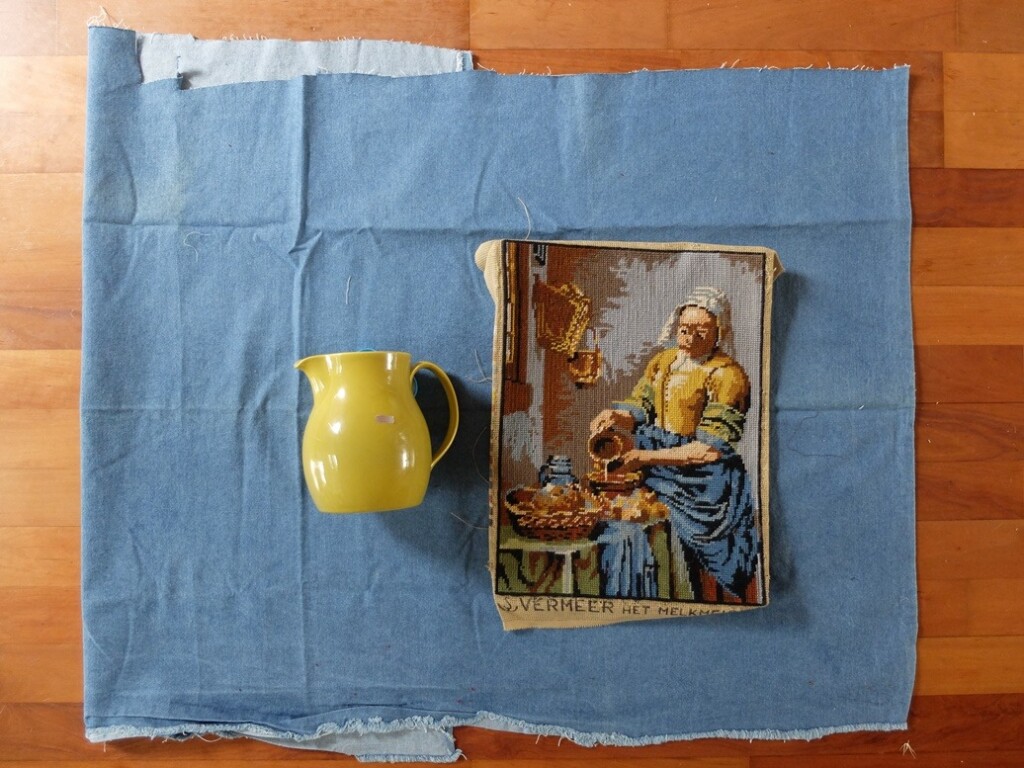Van oude tapisserie-schilderijen kun je mooie tassen maken. Meestal gebruik ik stevige keperkatoen of een mooie ribstof. Nu zie ik: ook denim is heel geschikt. Het geborduurde melkmeisje komt er prachtig op uit! Ik zat deze geborduurde weergave van het beroemde Vermeer-schilderij in m’n shop, en ben benieuwd welke nieuwe bestemming de melkschenkende vrouw dan gaat krijgen.