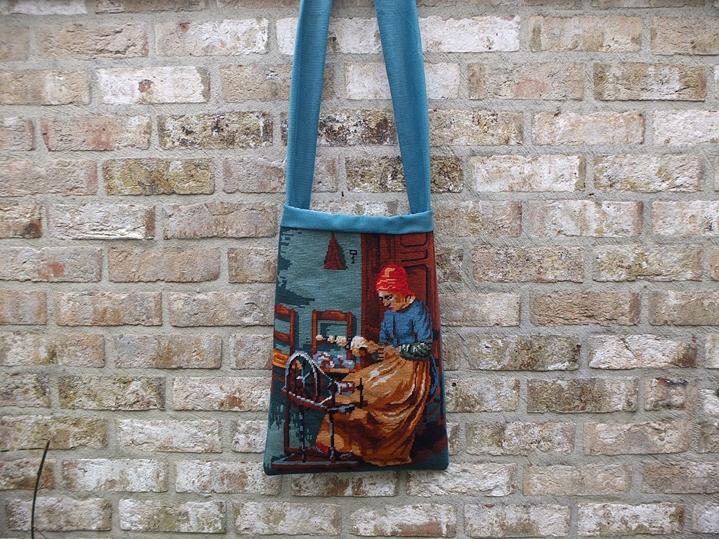Tapisserietassen: daar zit heel wat werk in! Als je graag wat bekijks wil, dan is een tapisserie-tas een goede manier. Ik vind het zelf leuk om er mee rond te lopen, maar ik vind het ook leuk om er nu รฉรฉn weg te geven. Een week geleden was het borduurwerk nog ingelijst achter glas en blogde ik erover (zeven stukjes naar beneden scrollen). Daarbij was de link weggevallen maar hier komt die link alsnog: ode aan de vrouw. Het stukje ging over de kracht van vrouwen en juist daarom vind ik het passend om deze tas te geven aan een jongeย vrouw die ik bewonder om haar kracht. Ze maakte een ernstige ziekte mee en heeft nu dagelijks te kampen met beperkingen. Maar als je haar ziet kom je onder de indruk van haar levensvreugde. Ik hoop dat de afbeelding van een andere ‘sterke vrouw’ haar bemoedigt bij het gebruik van deze tas. De boodschap van het filmpje was: vrouwen zijn sterk! Lieve M: deze tas is voor jou!