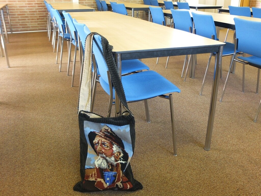 Deze tas plaats ik vandaag in de shop! Ik heb geen pijp in huis, dus daarom verzon ik maar om twee flessen neer te leggen voor de foto, want ik had iets nodig om aan te geven hoe groot deze tas is. Extra groot, door een brede rand ribstof (corduroy) eromheen. Die stoere stof vond ik goed passen bij deze stoere zeeman en samen vormen ze nu een stoer geheel. Een Tapisserietas voor iemand die graag wil opvallen! Stel je voor dat je met zo’n tas door bijvoorbeeld een museum loopt: superhip!