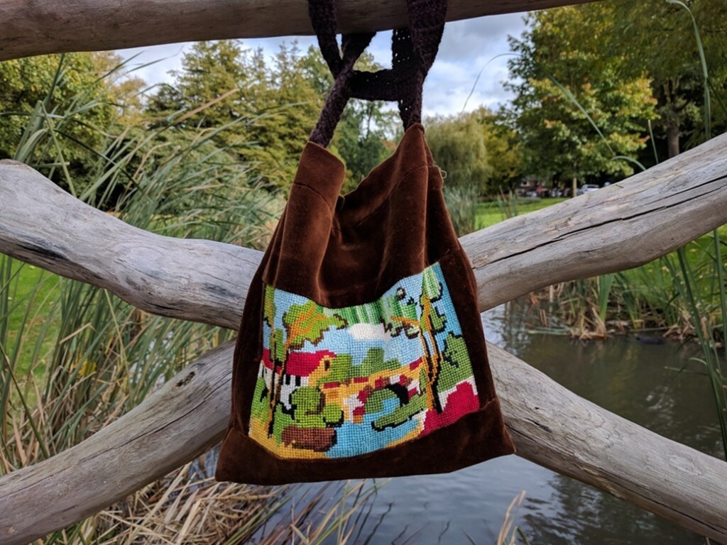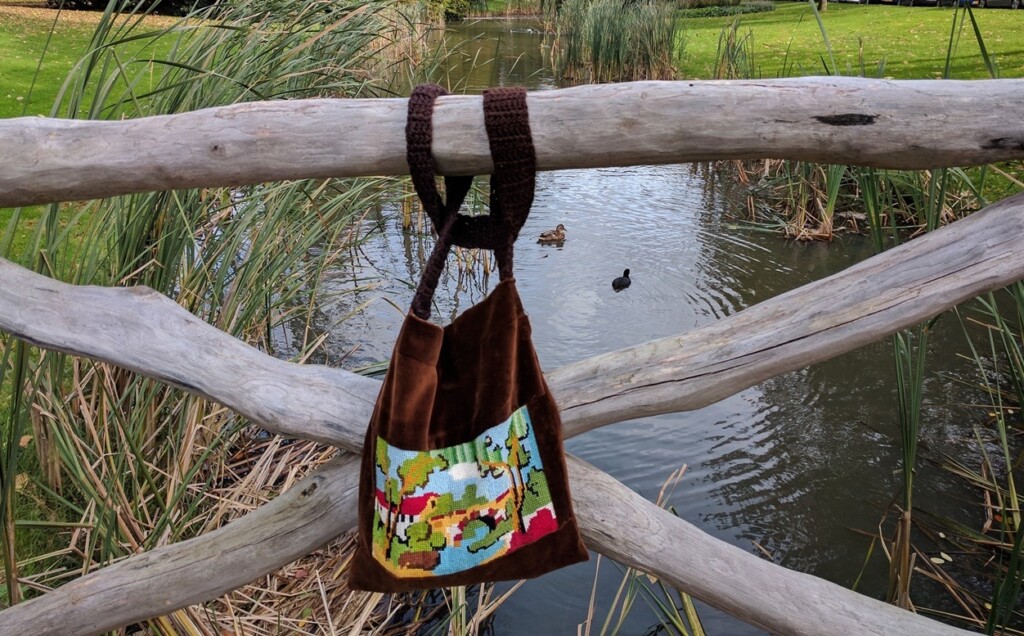 Het tasje nam ik gister mee en vlak voordat ik het gebouw binnenging wat in dit park staat, hing ik m’n tasje even aan het bruggetje. De onderste foto laat zien hoe je zo’n borduurwerkje verwerkt in een tasje: je naait de stof die je wilt gebruiken aan alle vier de kanten van het borduurwerk en kijkt net zolang tot je tevreden bent over de verhoudingen. Als je ook een stukje oud fluweel gebruikt, dan is het wel noodzakelijk om een binnenvoering te maken. Het hengsel heb ik gehaakt.