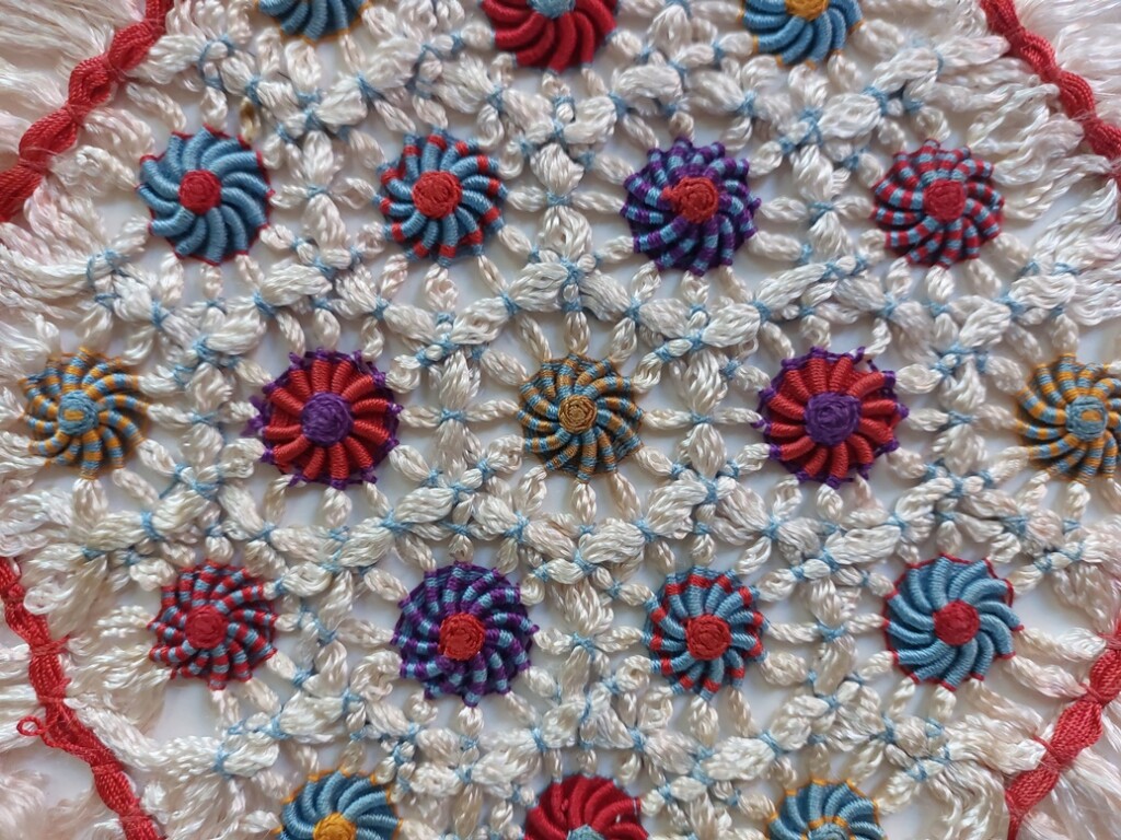 Een bijzonder kleedje, met bijeengedraaide bloemen. Deze techniek heet Tenneriffe. Dit was vroeger een populaire techniek.