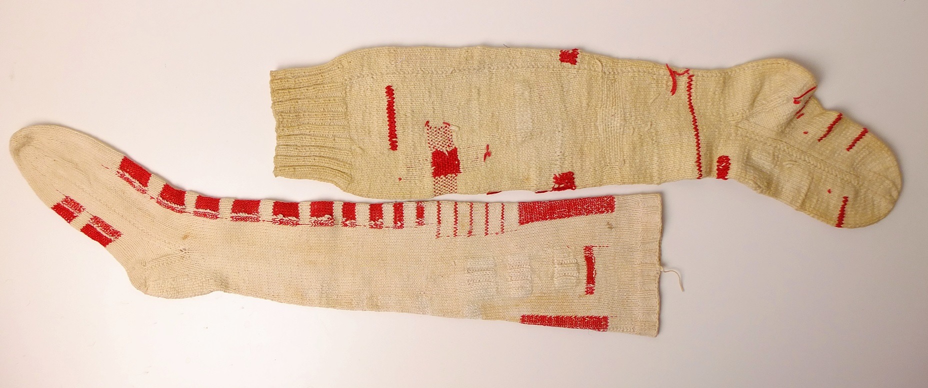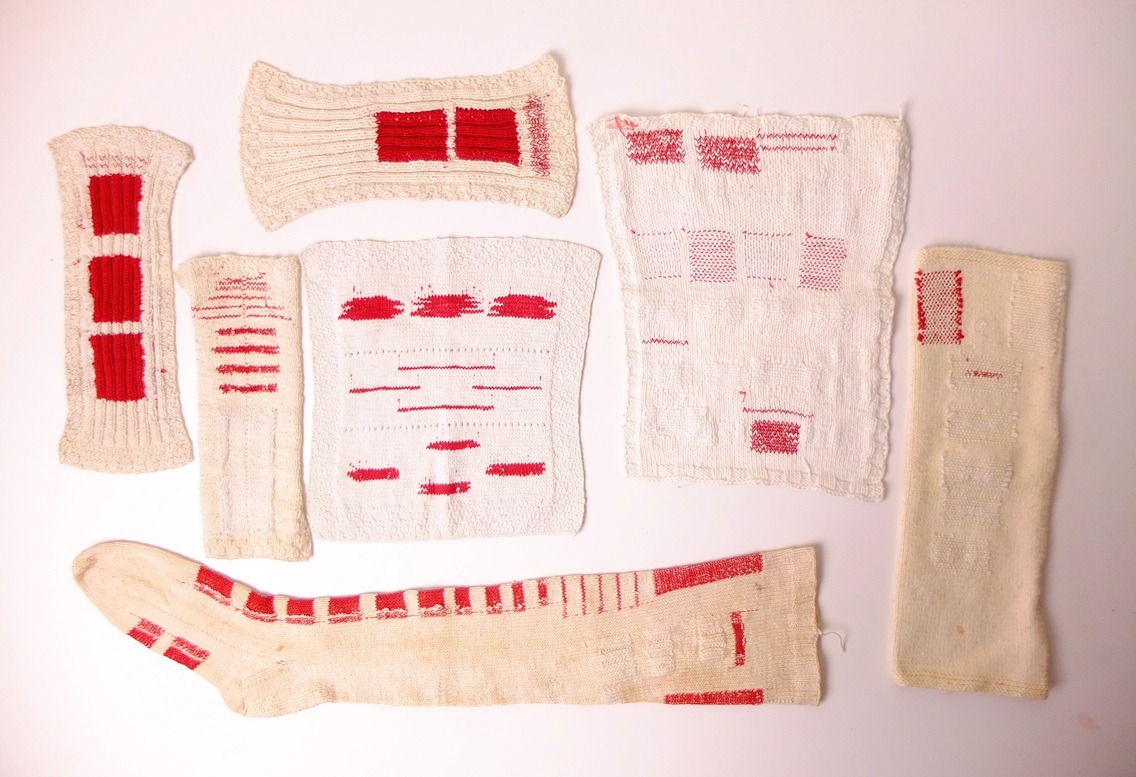 Voor de foto heb ik de rechtse foto van de folder nagebootst: oude breilapjes en sokken waarop de steken geoefend moesten worden. En uiteraard wil ik later nog eens terugkomen op dit bijzondere en oude breiwerk. Ik heb nog veel meer om te laten zien.