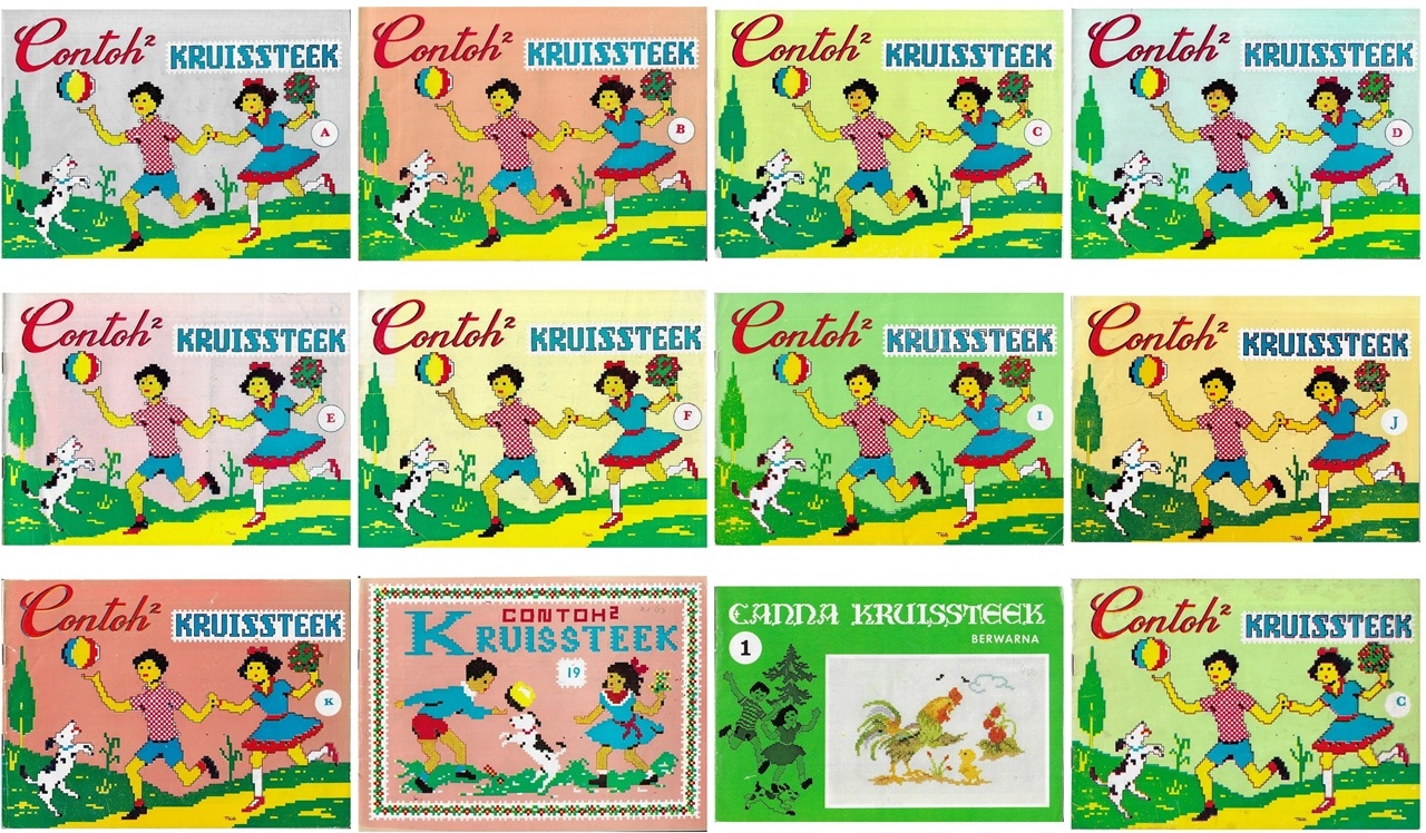 Boekjes die de meesten van ons vast nog nooit eerder hebben gezien: Contoh Kruissteek! Het zijn kleine boekjes, zonder colofon, zonder jaartal en kennelijk zonder achtergrond. Dus wat ik er van kan zeggen is niet anders dan wat er op de voorkanten is te zien. Het zijn deeltjes A t/m K, en dan later nog een deeltje 19, toen het alfabet kennelijk niet meer voldeed. Daarop is te zien dat de hond nu tussen de jongen en het meisje is gesprongen en mee wil spelen met de bal.
