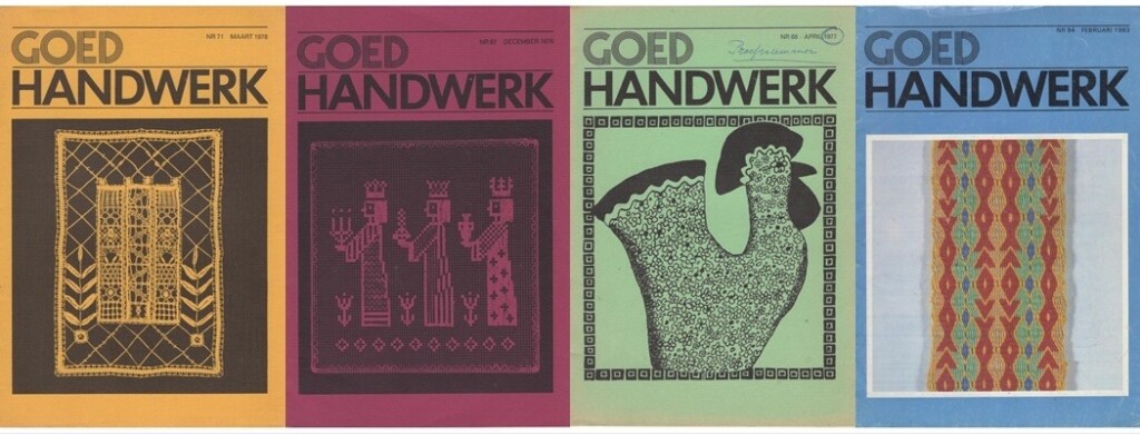 De Stichting Goed Handwerk gaf ook tijdschriften uit, en een paar oude uitgaven plaats ik in m’n shop. In de tijdschriften werd aandacht gegeven aan de nieuwe uitgaven, aan onbekende handwerktechnieken, en aan cursussen en het werk van textielkunstenaars. Het geeft een handwerkbeeld van de zestiger jaren.