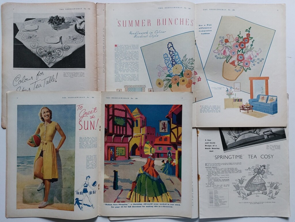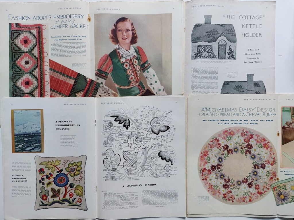 ‘Needlewomen’ in de Engelse dertiger jaren werden in gelijknamige tijdschriften aangespoord om mooie dingen te maken. Deze tijdschriften droegen uit waar deze naaldkunstsvrouwen zich graag mee tooiden en zich mee associeerden: vrouwelijkheid, sierlijkheid, huiselijkheid en elegantie. Prachtige ontwerpen voor huisdecoratie en kleding vulden de pagina’s en dan kon er weer volop worden geborduurd en genaaid en gebreid. Het accent in deze tijdschriften ligt op het borduren en daarvoor werd ook in elk tijdschrift een iron-on-transfer bijgesloten. Die zijn nog steeds bruikbaar want er ligt nu ook weer meer accent op het borduren maar dan lรฒs van de kruissteekjes.
