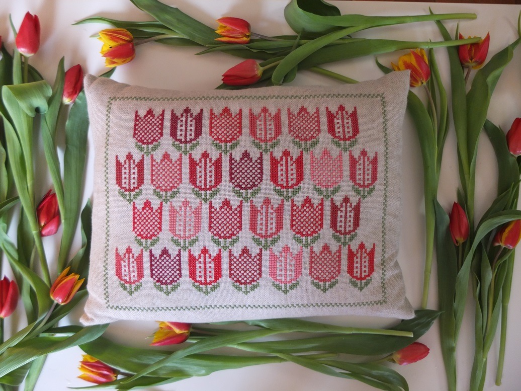 En tenslotte aan het eind van mijn week-van-de-tulp: Mijn tulpenkussen! Deze tulpjes borduurde ik vorig jaar naar een ontwerp van Ida Winckler. Ik borduurde op een wollen lap en vulde het kussen met veren.