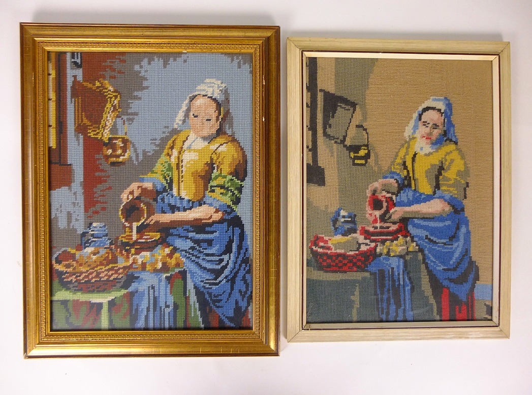 Nu ik zo met Tapisserie-schilderijen bezig ben, valt het me vaak op dat er zo’n verschil in kleurgebruik zit tussen de schilderijen. Ook de details zijn soms beter en soms minder goed uitgewerkt. Bij deze schilderijen is dat wel heel opvallend! Kijk bijvoorbeeld eens naar de kleding en de lamp. Of naar de kleur van de broodmand. En naar de (afwezige) plooien in het tafelkleed. Grappig! De echte Vermeer is ongeëvenaard, maar heel veel mensen hebben toch ook heel veel plezier in allerlei reprodukties.