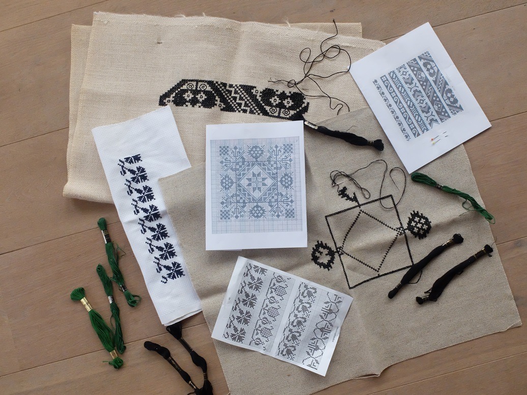 Vlak voor ons vertrek waren we nog een dagje naar Marken geweest en dat had me geïnspireerd om ook wat randen te borduren. Ik had gedacht dat ik in het gehuurde huisje eindeloze uren zou gaan borduren en dus had ik ruim voldoende handwerklinnen en strengen borduurgaren meegenomen. Maar toen we daar waren veranderde ik van gedachten: ik wilde fietsen! En wandelen! En helemaal niet meer borduren! Ik begon aan drie nieuwe borduurwerken maar die bleven al gauw steken. Daar ga ik later wel weer mee verder. Eerst lekker uitwaaien!