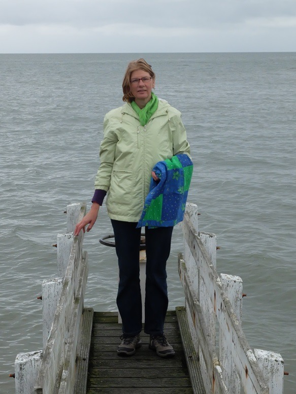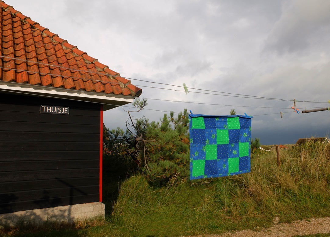 Een klein huisje was afgelopen dagen ons thuisje, en daar hing ik na aankomst gelijk m’n meegenomen quiltje aan de waslijn. Ik ben dol op waslijnen bij vakantiehuisjes en dit was ook weer zo’n mooie! Speciaal voor de gelegenheid neem ik altijd een oude quilt mee op vakantie, in de hoop dat ik die daar ergens kan fotograferen. En ook gebruik ik zo’n quiltje om op te liggen of te zitten of onder te slapen als het koud is.