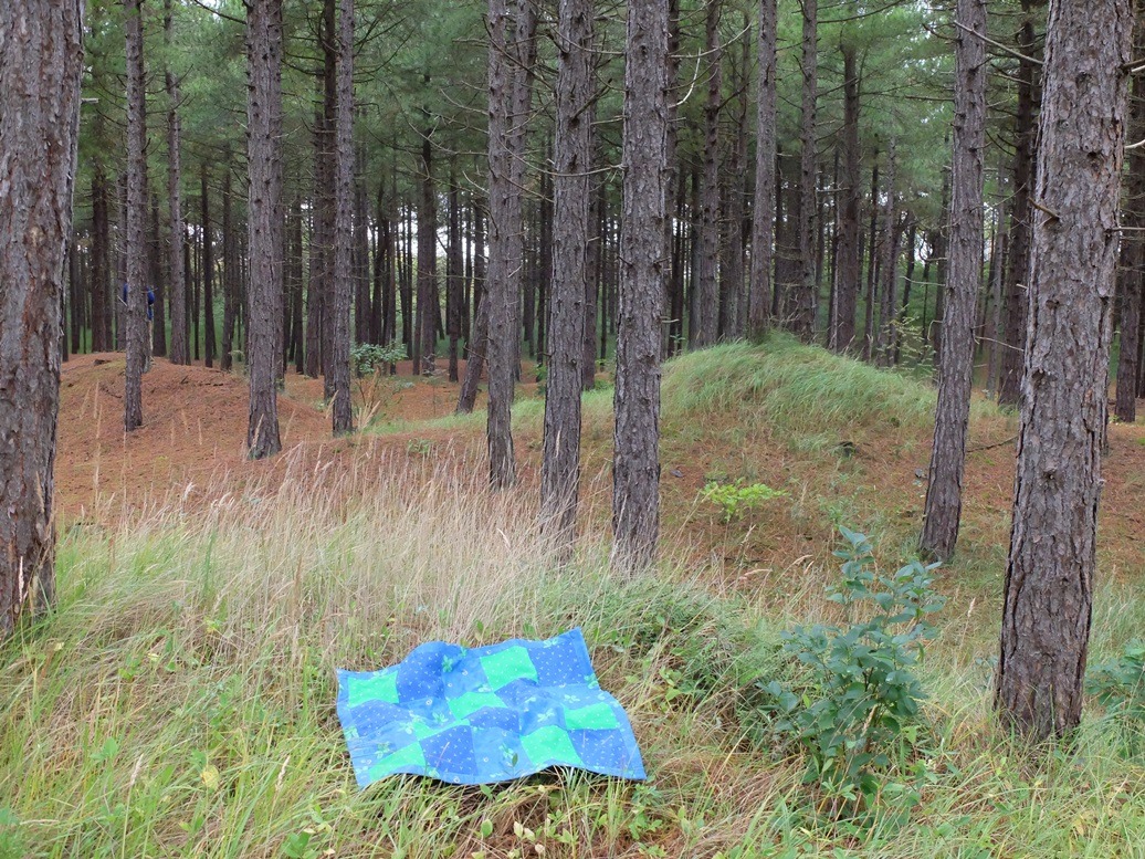Vlieland is auto-vrij, dus alles wat je mee wilt nemen moet je zelf dragen. Vanaf de boot naar de fietsenverhuur is dat maar dertig meter, dus als je met grote rugzakken wilt sjouwen is dat geen probleem. Maar ik had toch maar gekozen voor een klein quiltje om mee te nemen. Dit is één van m’n oudste quiltjes, van alweer heel wat jaartjes geleden. Ik was toen wat aan het experimenteren met kleuren en was blij met dat fel-groene katoentje wat ik had gevonden. Dat was toen nog iets bijzonders, want die felle kleuren waren nog niet zo makkelijk verkrijgbaar in stoffen als nu. Maar de natuur heeft ‘natuurlijk’ altijd al fris-groen in de aanbieding gehad! Ook op een regenachtige dag toonde dit bos niet somber en dat wilde ik even op de foto zetten voordat we weer verder fietsten.
