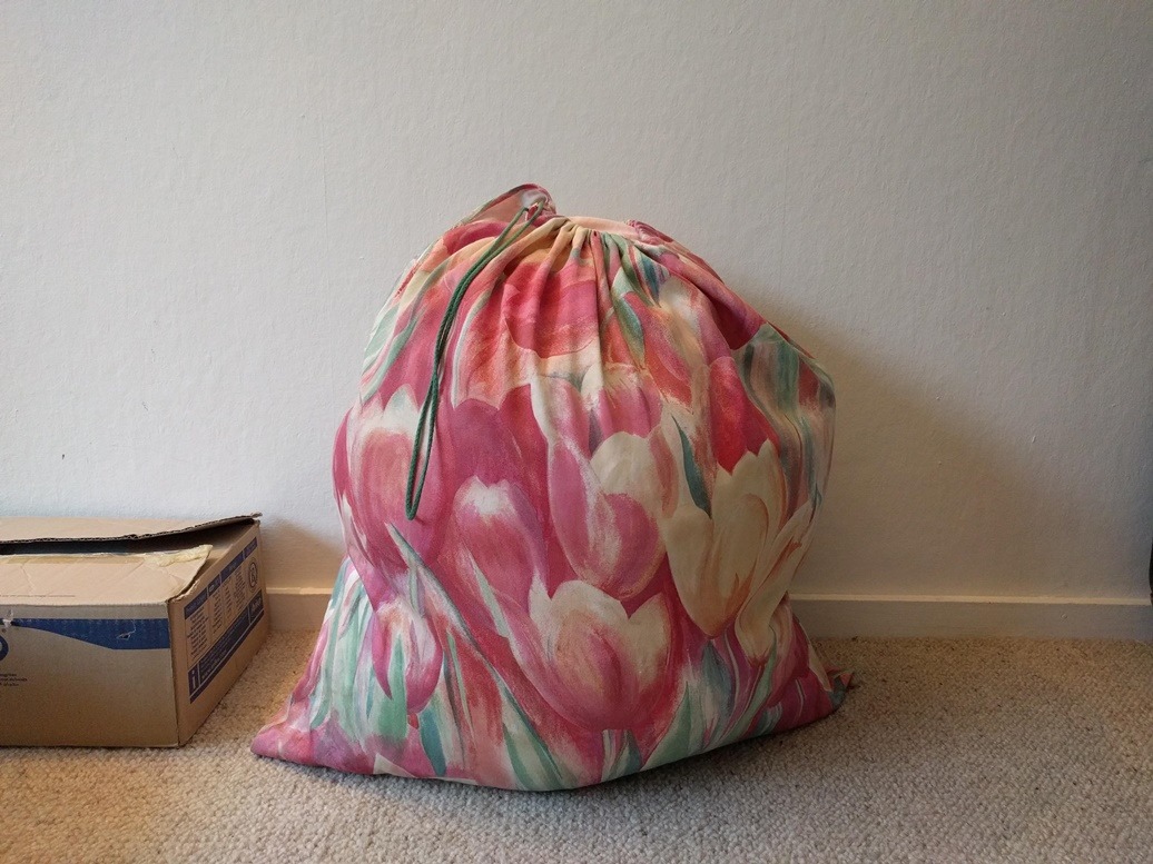 Ik vroeg aan m’n zus of ze m’n verhuiszakken wilde lenen, maar dat hoefde niet. Ze had ze nog. O ja, dat was ook zo, ik had haar ook al eens een stapeltje gegeven. En zo zag ik nu bij haar verhuizing die leuke tulpenzak weer, die ik lang geleden maakte en die al zo vaak handig is gebleken. Grote lap stof over? Maak er een verhuiszak van!