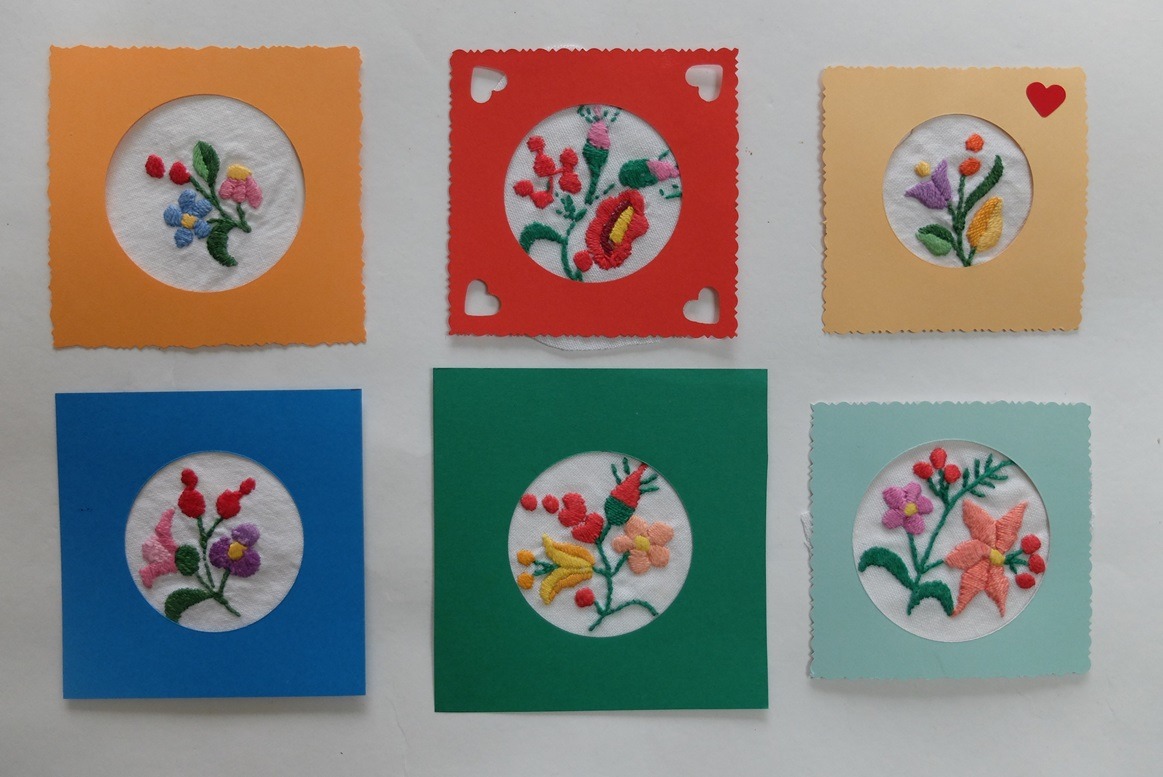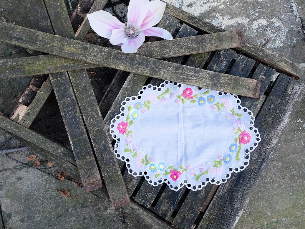 Ik legde er een geborduurd kleedje op, wat eveneens versleten is. Een kleedje wat zo vaak gewassen is dat er slijtplekjes zichtbaar zijn. Maar de bloemetjes zijn nog mooi: aan beide kanten precies even keurig afgewerkt. De bloemetjes lachten ook. Je zou ze kunnen uitknippen en als decoratie kunnen gebruiken. Of gebruiken om er kaarten mee te maken. Ik heb dat vroeger wel eens gedaan en het geeft een mooi effect.