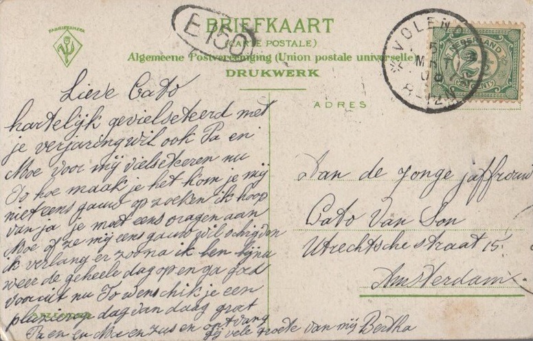 Deze oude ansichtkaarten laten een beeld zien van honderd jaar geleden. De tijd waar we graag Achterkant-oude ansichtkaart Volendamnostalgisch over doen over hoe mooi de klederdracht eruit zag. Maar ik denk niet dat het zo comfortabel was op die klompen, met die lange rokken, op de koude stenen, en in de scheefgezakte huizen. Bertha heeft de rechterkaart uitgezocht om Cato te vielseteren en na dat eerste zinnetje gebruikt ze de rest van de kaart om haar eigen situatie onder de aandacht te brengen. Verlangen naar contact met haar Amsterdamsche familie. De kaart is geadresseerd aan jongejuffrouw Cato met een adres in Amsterdam en het poststempel is van Volendam. Zou ze daarheen gestuurd zijn om aan te sterken? Arme Bertha, die ver weg van huis moest uitzieken.