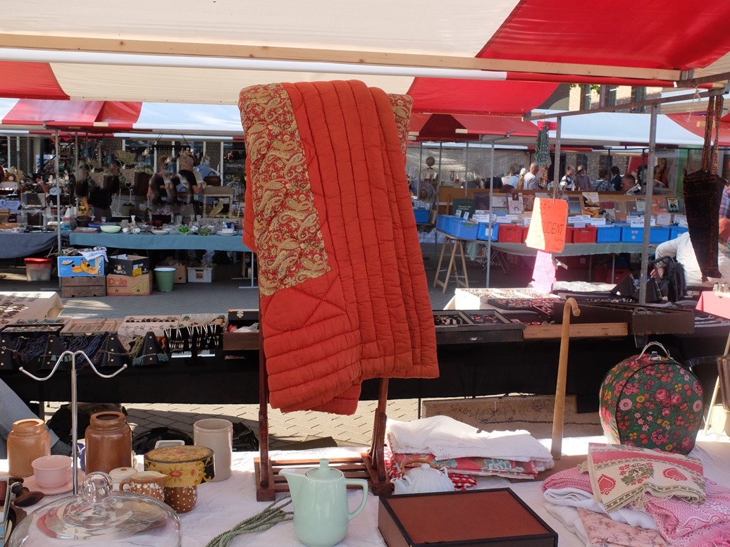 Op de antiekmarkt in Apeldoorn maakte recent een foto van zo’n gewattteerde deken, die daar op een marktkraam hing. Dat geeft een vrolijk en zomers beeld van zowel de deken als de markt. Dit soort dekens horen van oorsprong in een bedstee, maar nu worden ze vooral gezien als aanvulling op handwerkcollecties en een antiekmarkt is dan ook een goede plek om hem op te hangen. En nu dus ook op mijn blog! Ik vind het zelf reuze leuk dat ik deze dekens nu kan aanbieden en ben benieuwd naar reacties!