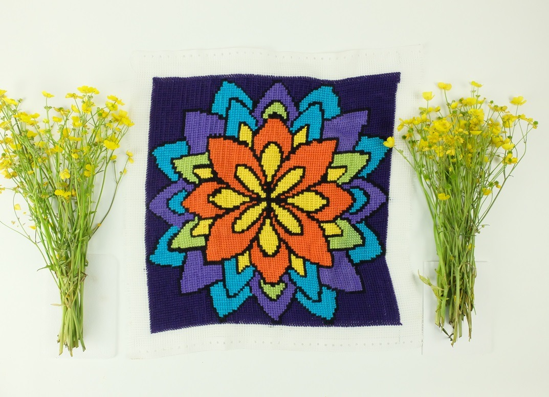 Ik weet een goede manier om weer vrolijk te worden: bloemen plukken (maar mijn boterbloemen zijn alweer bijna uitgebloeid en m’n tafel ligt bezaaid met gele blaadjes). Een nog betere manier is: iets met dit borduurwerk doen! Ik kocht het een paar dagen geleden en zou het natuurlijk best zelf kunnen houden want dit zijn nou helemaal precies de kleuren en motieven waar ik blij van wordt! Maar misschien heeft iemand anders ook wel ideeën wat ze hiervan zou willen maken. De meest voor de hand liggende bestemming is natuurlijk een kussen. Dan moet het werk nog wel even wat worden opgespannen, want het bobbelt nogal. Maar op een grote tas: ook heel mooi!