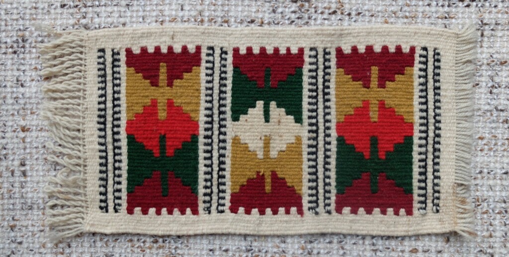 Het geweven kleedje had ik mee op vakantie. Dat legde ik op een onpersoonlijk bijzettafeltje en dat was dan gelijk het centrale plekje om de sleutels en de mobiel op te leggen. Zo’n prachtig kleurrijk kleedje, waar zou het gemaakt zijn? Ik hou ervan om vaak tegen deze mooie grafische ontwerpen en kleurencombinaties aan te kijken. En het is ook leuk om wat te lezen over de verbazingwekkende oude culturen, waarin zulke prachtige kleden zijn geweven.