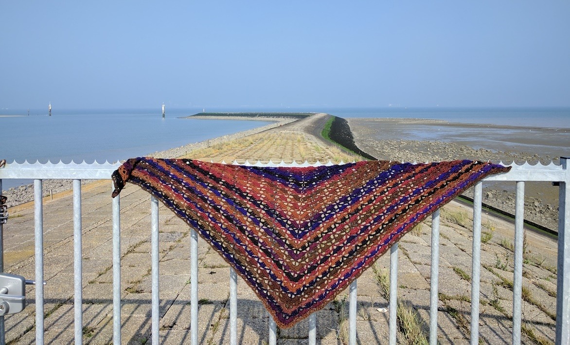En nu verheugde ik me er dus op om m’n stola van wibra-wol nog eens te laten zien. Gefotografeerd bij Breskens. Aan de overkant van de Westerschelde ligt Vlissingen, en daar hoop ik ook nog eens naar toe te gaan. Wat heeft Nederland mooie plekjes! En wat hebben we een fijne haakmogelijkheden! Oude handwerkboeken en nieuw wol: op haakgebied hebben we het goed.