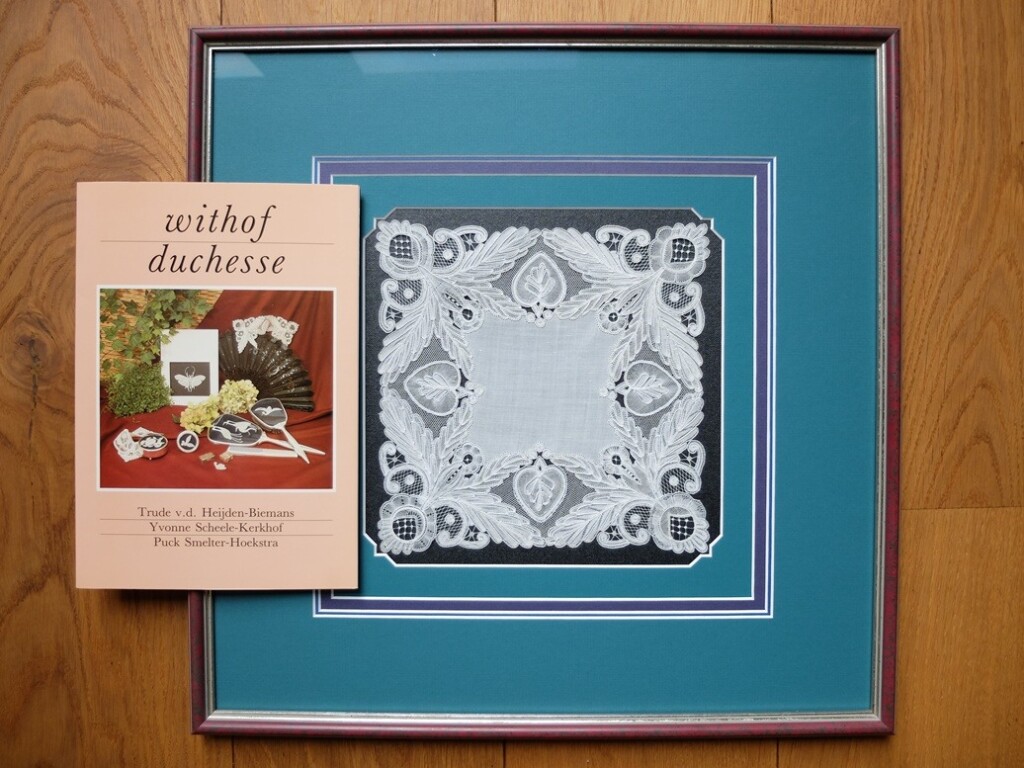 Sprankelend en stralend: zo zag de ingelijste kant eruit die ik bij Yvonne Scheele-Kerkhof mocht bewonderen. Ze haalde voor mij een ingelijst kant van de muur zodat ik het op de grond kon fotograferen. Al vaker zocht ik haar op na een antiekmarkt, en nu ook weer. Nadat we een tijdje hadden gepraat haalde ik een boekje uit m’n tas en vroeg of ik het in haar atelier mocht fotograferen. In 1988 was