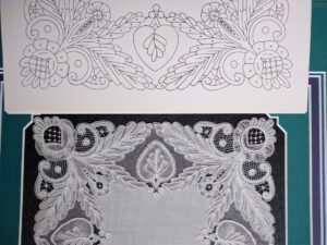 Kenmerk voor Withof Duchesse kant is het dichtere weefsel en het gericht aanbrengen van contouren in de ontwerpen. Het spel van reliëf en schaduwwerking, en dat is dan in deze detail-foto’s ook te zien.