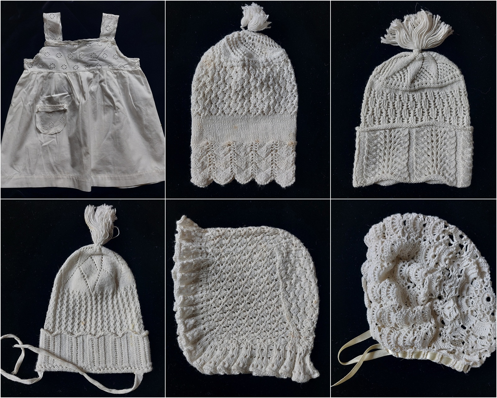 En die foto’s zijn een goede ‘kapstok’ om zelf ook nog wat wit babygoed in mijn shop te zetten. Een klein babyjurkje en een aantal schattig gebreide babymutsjes. En รฉรฉn gehaakt. Ze zijn geliefd onder verzamelaars van oud breigoed, maar ze kunnen ook heel goed weer opnieuw op een babybolletje geplaatst worden.