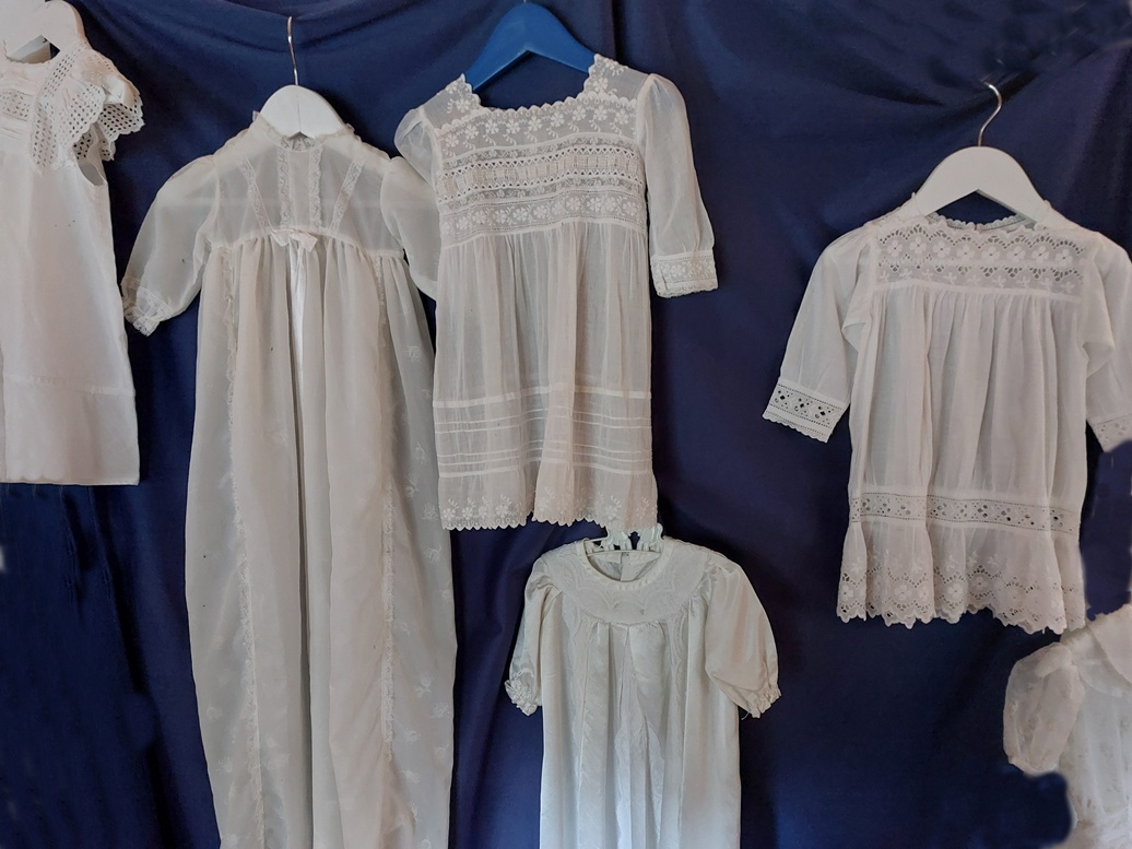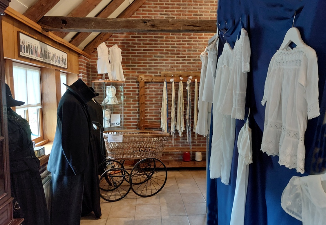 In รฉรฉn van de gebouwen van het museum met streekgeschiedenis van Twente, is ook een ruimte ingericht met de kleding van vroeger. Ik bekeek een wand met witte jurkjes en maakte er een foto van.