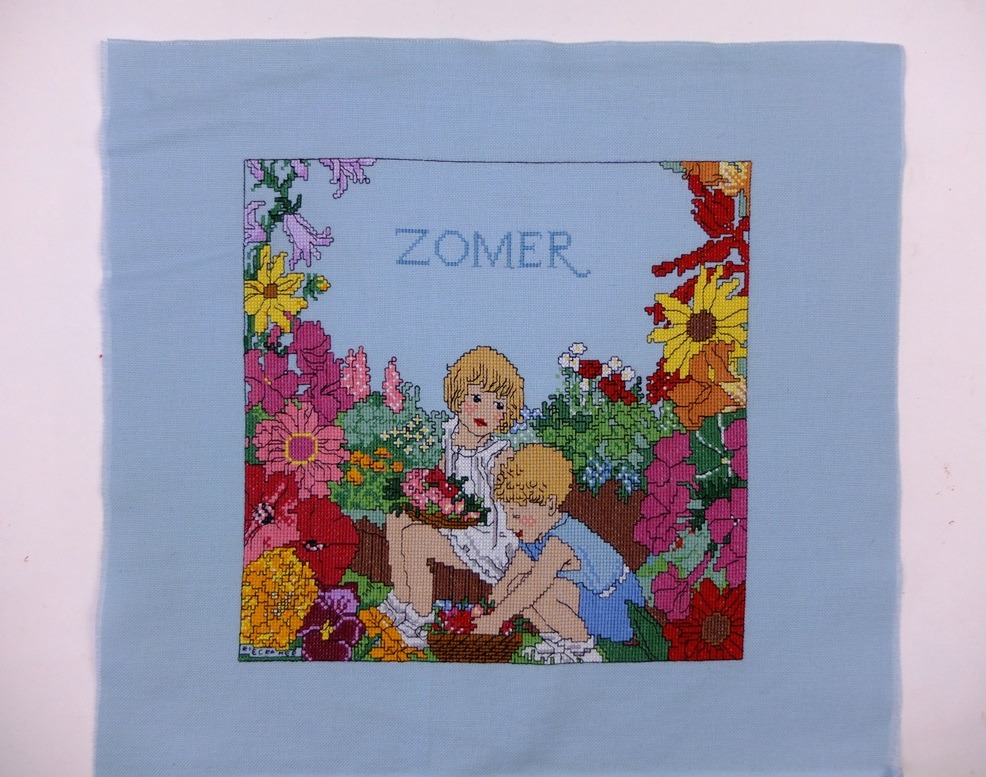 De zomer is vol kleine en grote geneugten! Zoals dat ik vanmorgen aardbeien at bij het ontbijt, dat tuindeur open staat, dat ik kan fietsen zonder jast of vest. Nadat ik eerst de planten buiten water gaf, zit ik hier in de stilte van de ochtend te genieten van de voorrechten van een mooi jaargetijde en me te verheugen op een mooie dag die voor me ligt. De blijdschap over de zomer kan op veel manieren worden uitgedrukt (ik laat het nu maar even bij die opsomming van de aardbeien en de overige open deuren….). En dat is door talloze dichters en schilders ook gedaan. Veel mooie plaatjes om van te genieten. Eén van die kunstenaars was Rie Cramer (haar naam staat nog net te lezen in het linker hoekje). Ze was in de vorige eeuw een bekende illustratrice en schrijfster. Ik ben net als heel veel anderen met haar boekjes opgegroeid, en kan enorm genieten van dit mooie borduurwerk. Nostalgie, maar ook opnieuw: Zomervreugd!