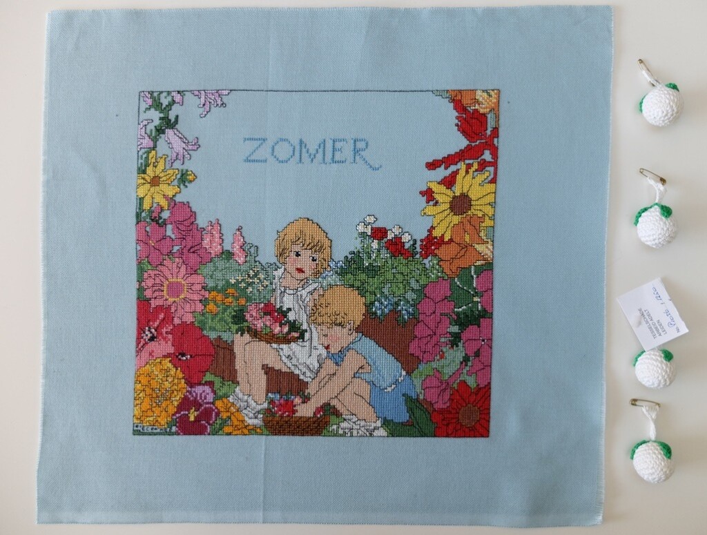 Het borduurwerk is naar een ontwerp van Rie Cramer, die in de Jugendstil-periode alles een romantisch aanzicht gaf. Tegenwoordig zie ik de kindertjes niet meer zo schattig met de bloemetjes spelen (helaas).